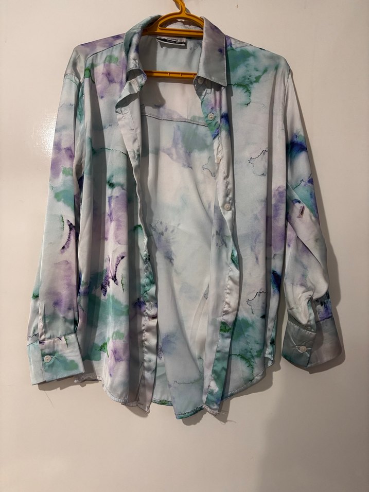 Bol kesim, uzun kollu, yakalı ve düğmeli kadın gömleği. Pastel renkli tie-dye desenli, yumuşak sentetik kumaştan, günlük rahat kullanım için uygun.