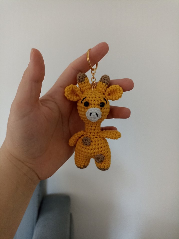 Renkli tığ işi detaylara sahip, deve renginde zürafa peluş oyuncak anahtarlık. Altın renkli anahtarlık halkası bulunur.