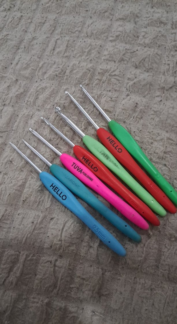 8 parça renkli tığ seti, ergonomik saplı ve üzerinde "HELLO" yazılıdır. Farklı tığ işleri için uygundur. 3adet 3 numara, 2adet 2.5 numara, 1 adet 2numara, 1 adet 3.5 numara, 1adet 5 numara