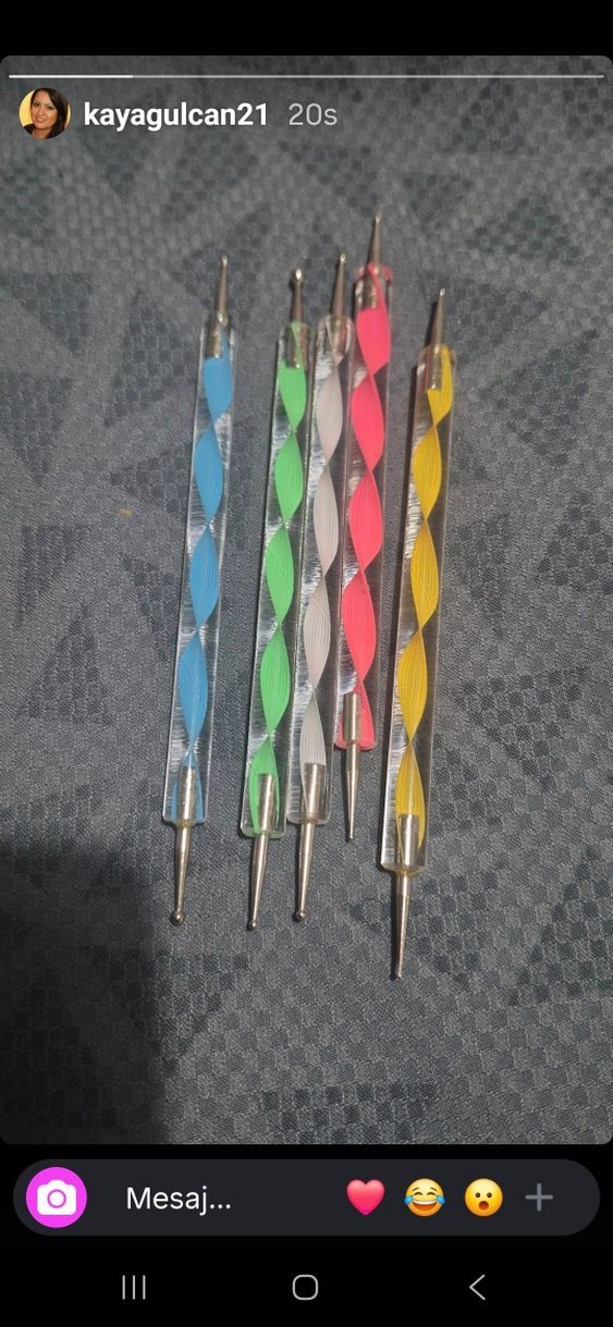 Çift uçlu, renkli tırnak süsleme kalemleri. Her kalem farklı canlı renkte burmalı tasarıma sahip.