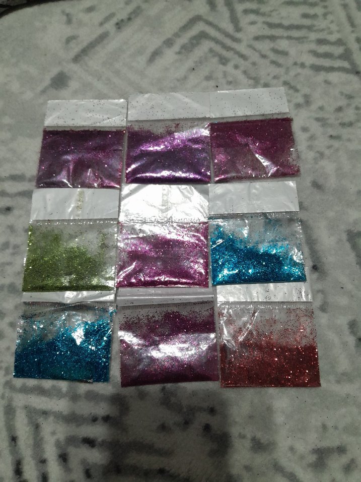 Çeşitli renklerde koyu parlak tırnak süsleme simleri içeren küçük paketlerden oluşan set.