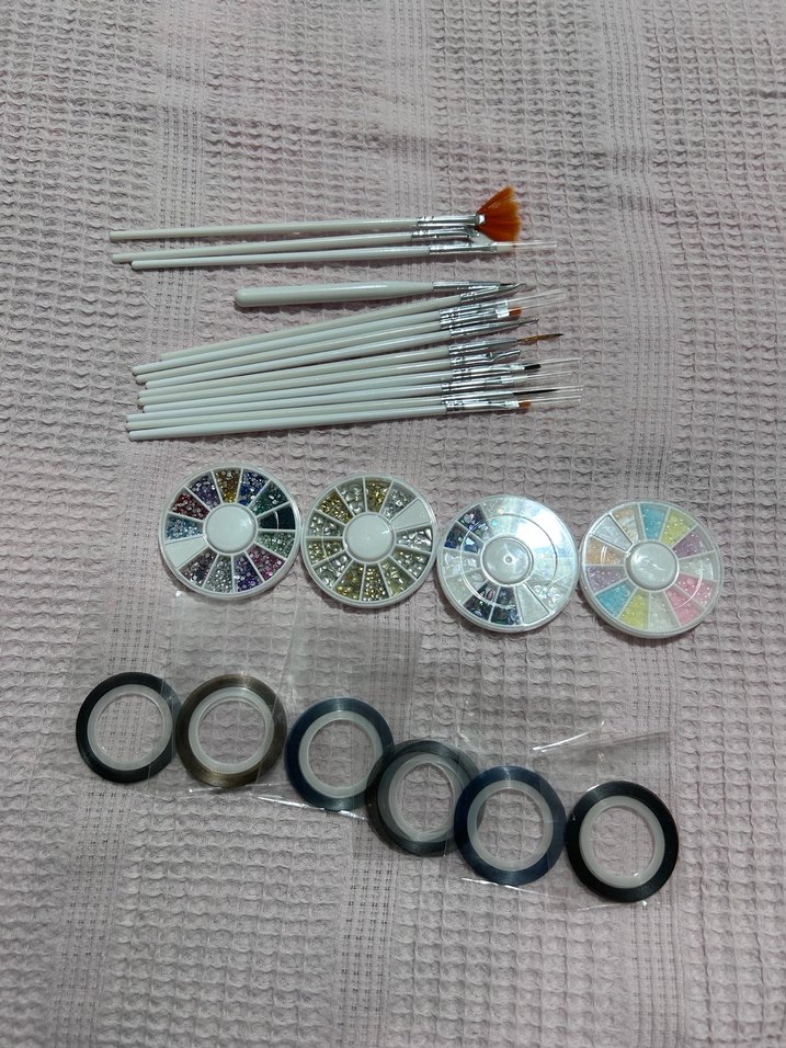 Çeşitli renklerde taşlar, ince tırnak bantları ve farklı boylarda fırçalar içeren tırnak süsleme seti.