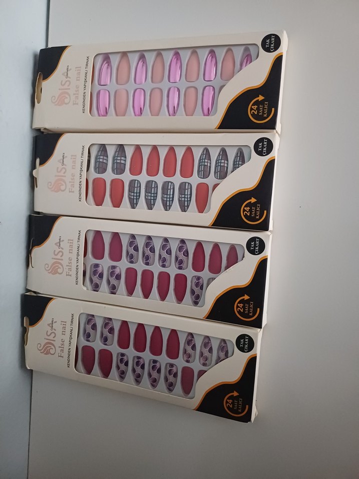 24 parçadan oluşan, çeşitli desenlerde ve canlı renklerde yapışkanlı tırnak süslemeleri seti.