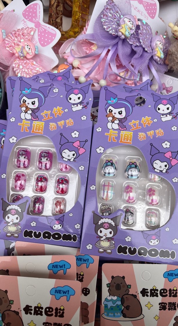 Mor renkli Kuromi ve Capy Bara temalı çeşitli desenlerde renkli tırnak süslemeleri. Tırnaklara eğlenceli detay katmak için uygun.