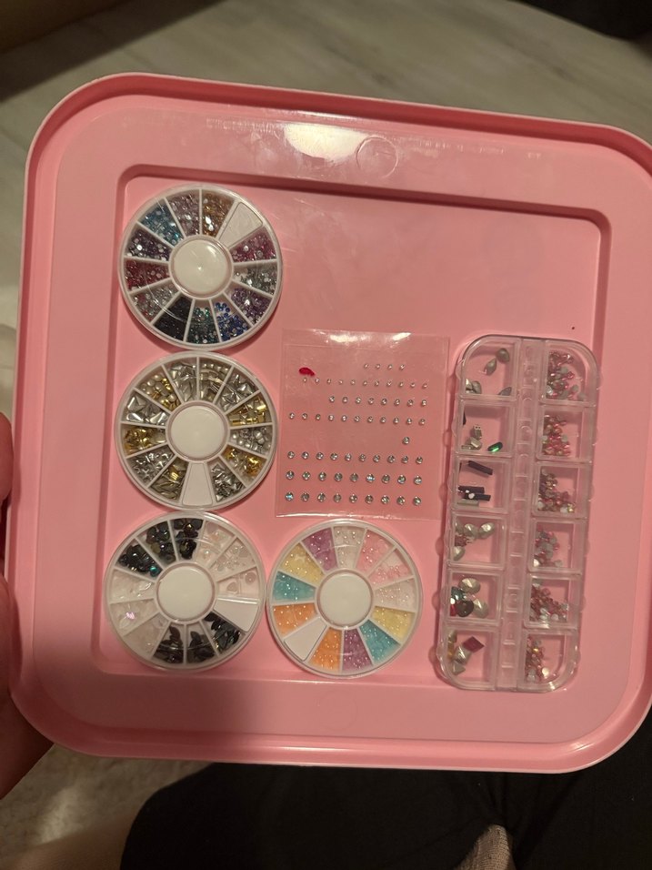 Çeşitli şekil ve boyutlarda renkli tırnak süslemeleri içeren pembe saklama kutusunda set. Yaratıcı tırnak tasarımları için uygun.