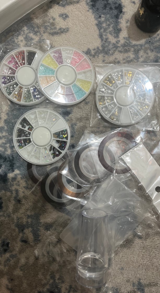 Yuvarlak kutularda çeşitli açık renkli, çok renkli tırnak süslemeleri içeren set.