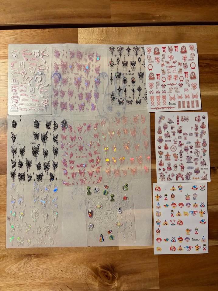 Çeşitli açık ve canlı renklerde tasarımlar içeren renkli tırnak süslemeleri seti.