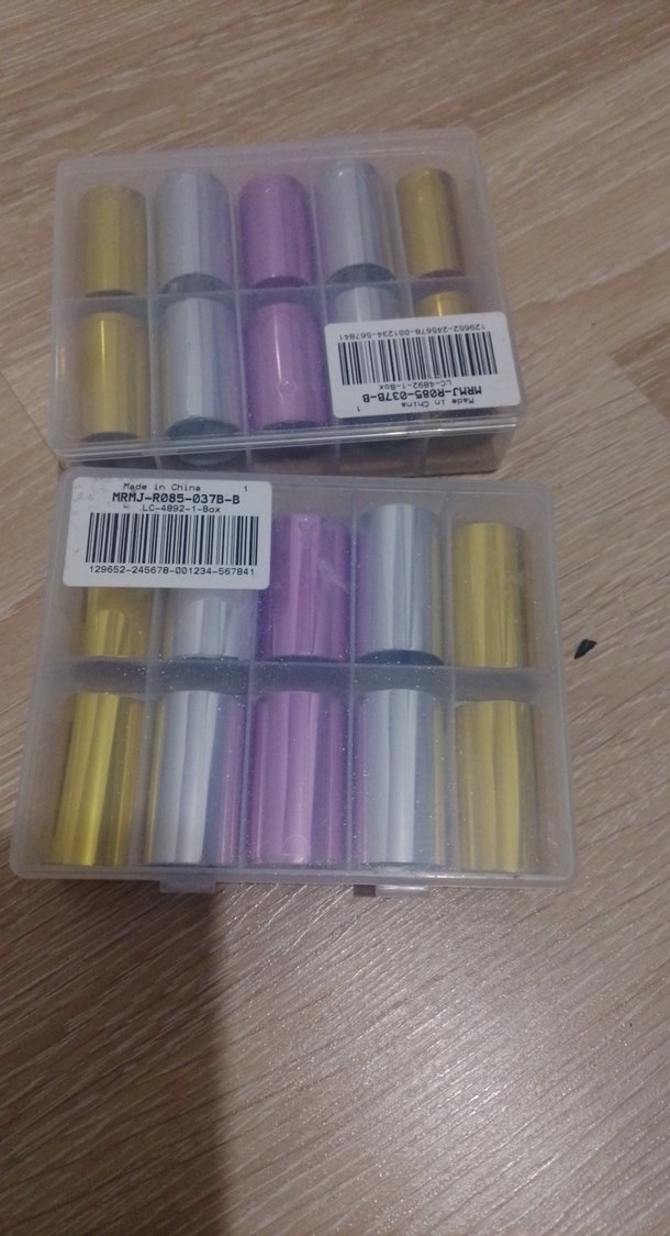 Altın, gümüş ve pembe gibi canlı açık tonlarda renkli tırnak süsleme folyoları içeren kompakt kutu seti.