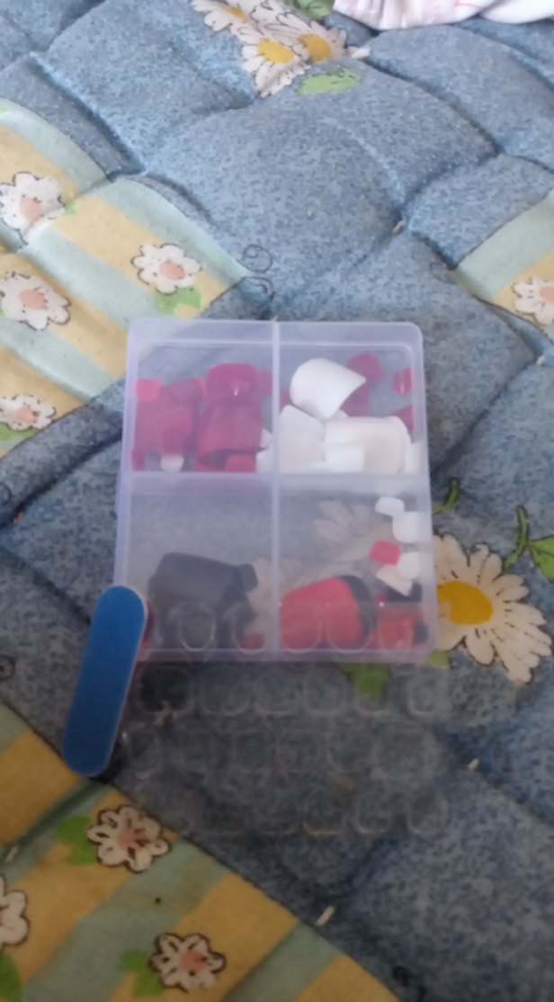 Bölmeli plastik kutuda kırmızı, beyaz ve siyah gibi canlı ve açık tonlarda renkli tırnak uçları seti.