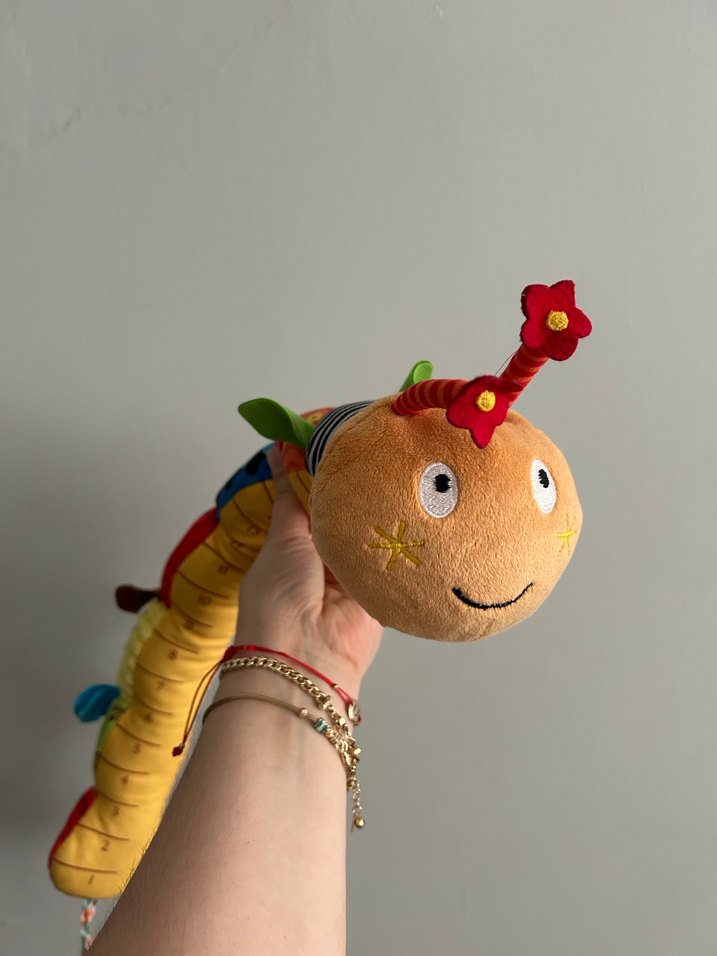 Yumuşak dokulu, renkli tırtıl peluş oyuncak, çiçek antenleri ve neşeli yüz ifadesiyle çok sevimli. Çok renkli gövdesi oyun havası katıyor.