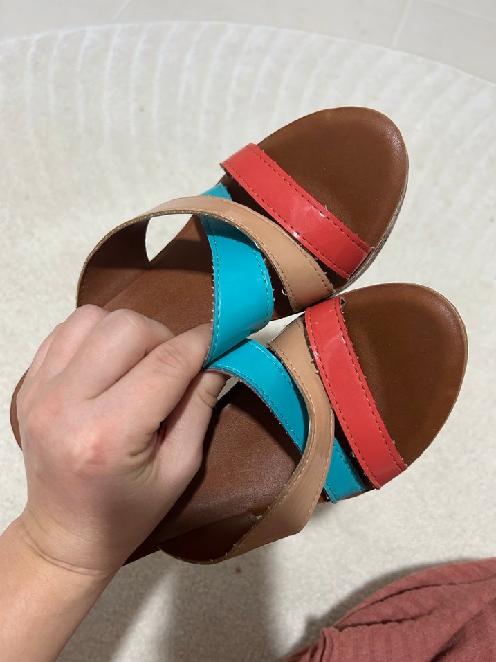 Renkli tokalı bantlara sahip, dolgu topuklu kadın sandaletleri. Kauçuk malzemeden, bohem tarzda, günlük kullanım için uygun.