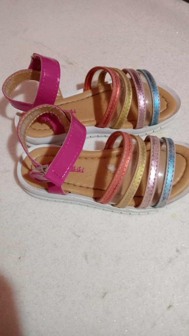 Bu renkli kız çocuk sandaletleri, parlak çoklu bantlar ve tokalı bilek kayışı ile rahat ve sağlamdır. Kauçuk tabanlıdır.