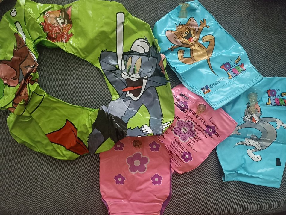 Tom ve Jerry karakterli, çocuklar için renkli şişme kolluklar. deniz simidi