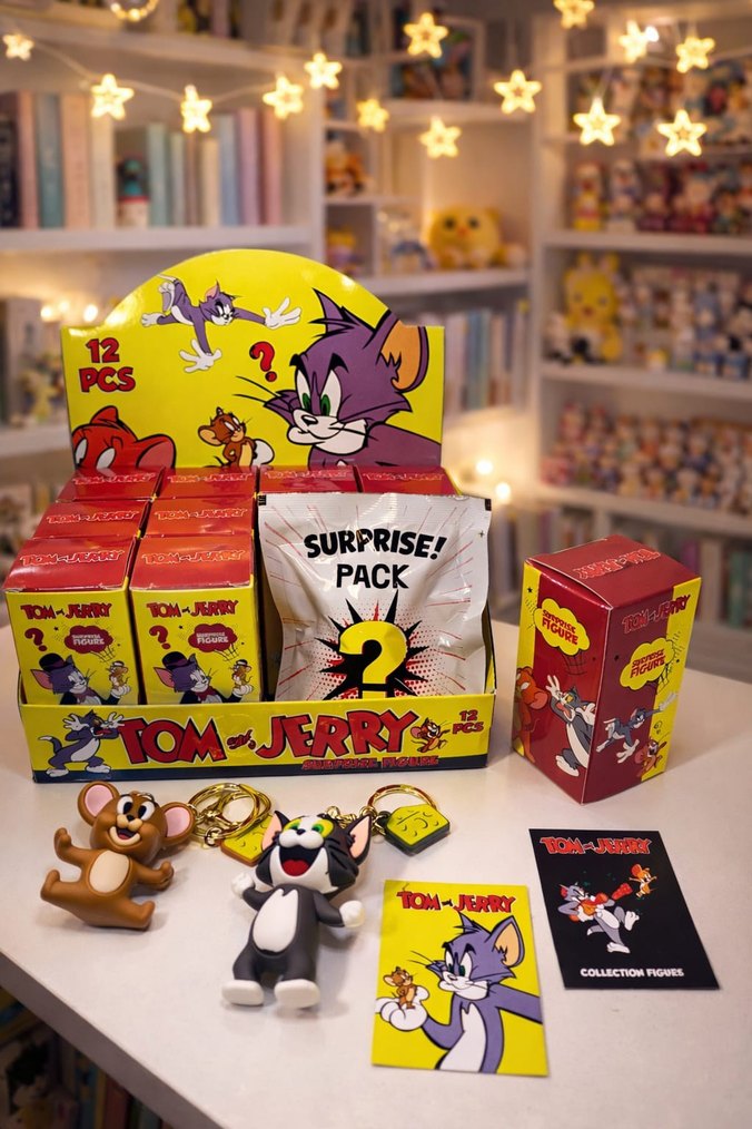 Renkli Tom ve Jerry sürpriz paketi, koleksiyon figürleri ve anahtarlıklar içerir. 12 parçadan oluşur, canlı tasarımlı karakter kartları ile birlikte.