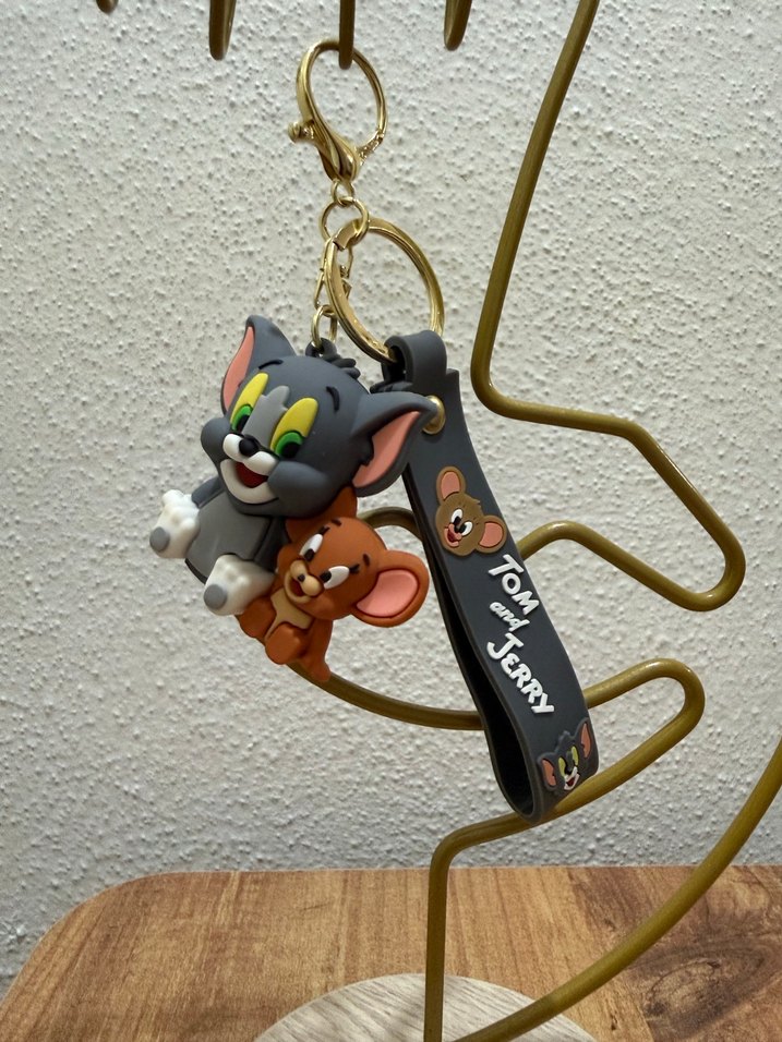 Renkli Tom ve Jerry figürlü, zincir detaylı ve gri kayışlı anahtarlık. Sokak tarzı ve rahat punk havası katıyor.