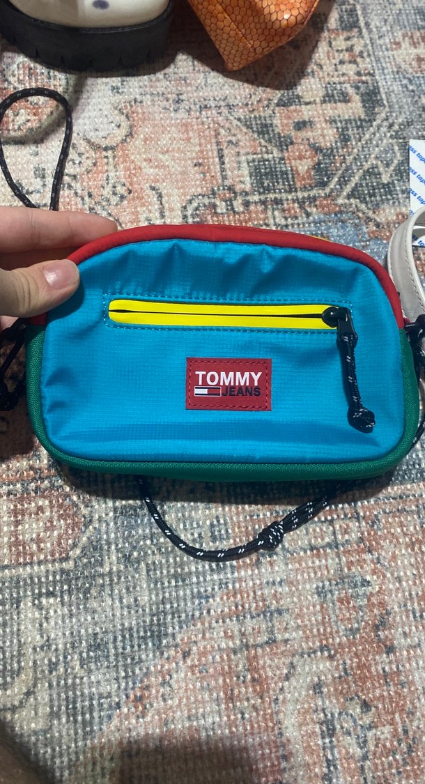 Canlı çok renkli kumaştan yapılmış, önünde fermuarlı cep ve baskılı Tommy Jeans logosu bulunan renkli bebek çantası.