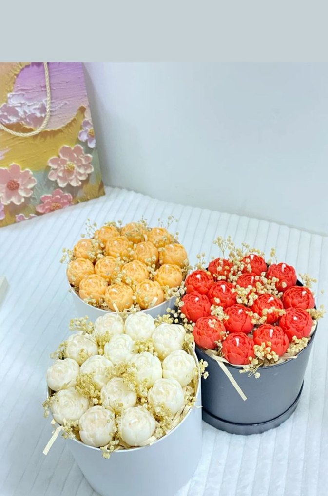 Beyaz, turuncu ve kırmızı renklerde küresel mumların dekoratif kuru çiçeklerle birlikte yuvarlak kaplarda düzenlendiği set. ️