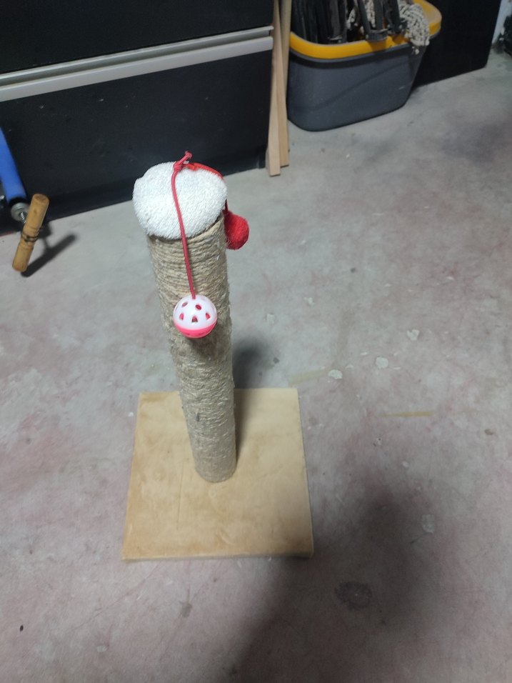 Renkli topu olan beyaz kedi tırmalama direği, kedilerin oyun oynaması ve tırmalaması için uygundur.