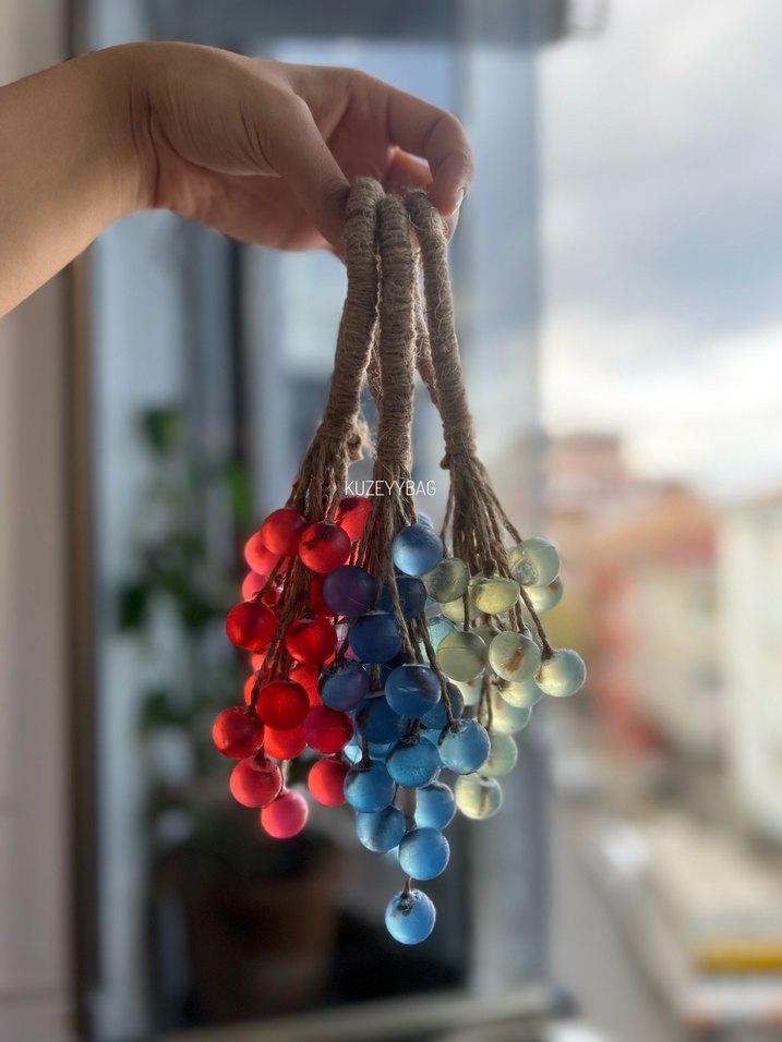 Kırmızı, mavi ve açık yeşil tonlarında, doğal iplerle bağlanmış, boncuk şeklinde dekoratif sabunlar. 3 adet