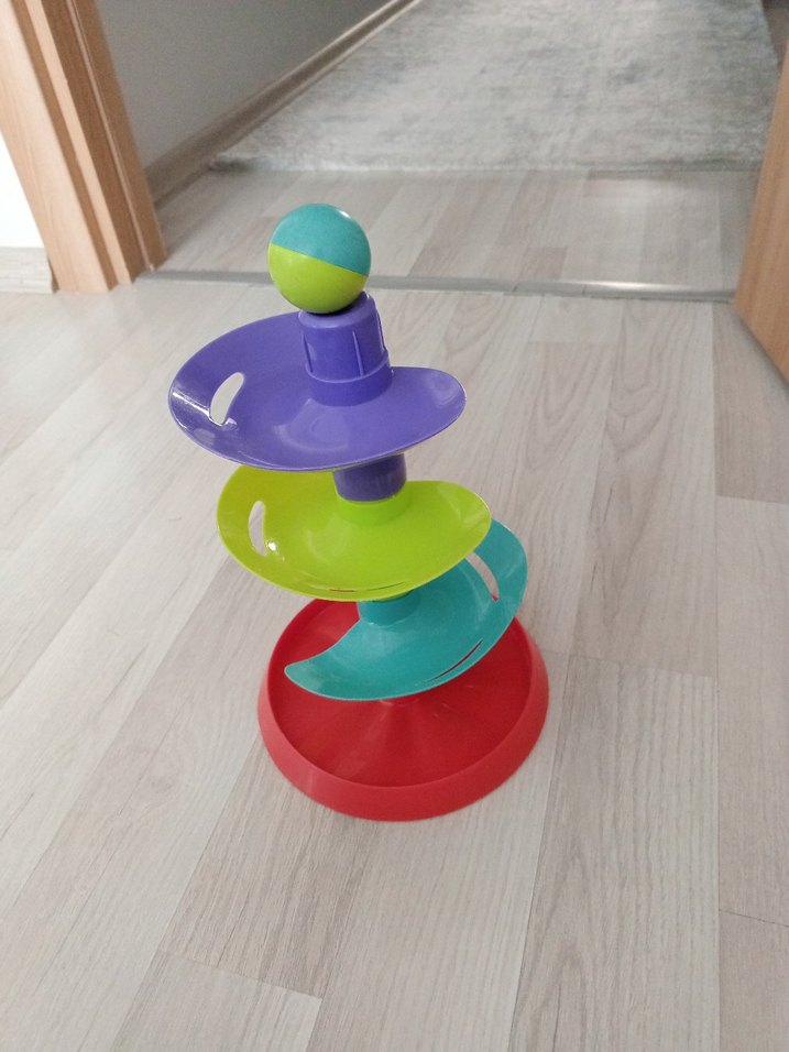 Renkli spiral yollu ve top içeren eğitim oyuncağı. Motor becerilerini ve koordinasyonu geliştirmeye yardımcı olur.