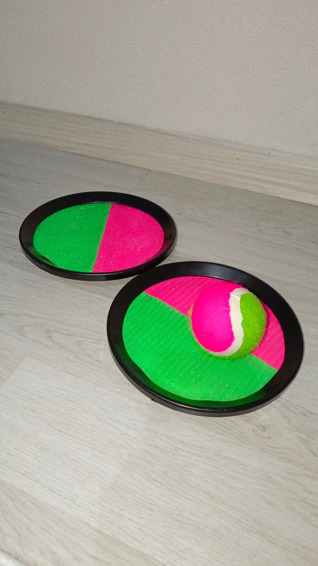 Parlak pembe ve yeşil renklerde, iki yuvarlak raket ve top içeren renkli oyun seti.