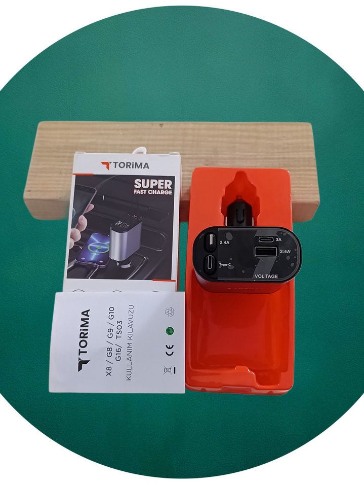Çoklu USB portları ve voltaj göstergesi olan renkli Torima Super hızlı araç şarj cihazı, hızlı ve verimli şarj sağlar.