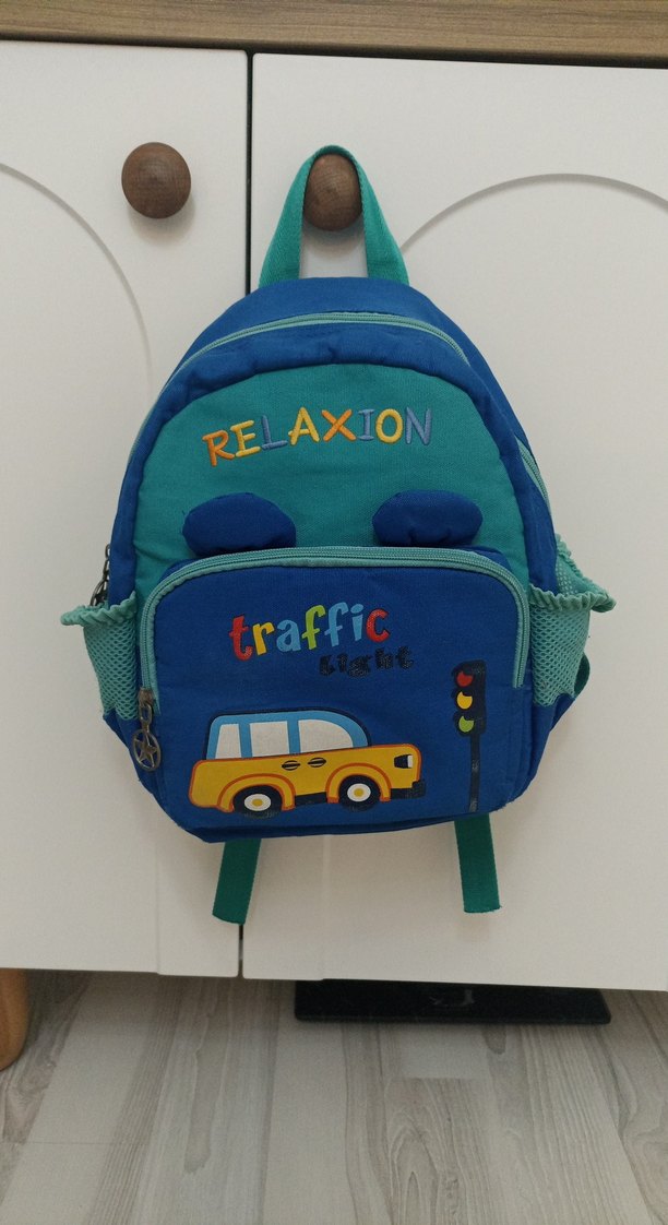 Mavi renkte, trafik temalı nakışlı çocuk okul çantası. Önünde "RELAXION" yazısı ve araba ile trafik ışığı desenleri bulunur. Yanlarda file cepler ve ayarlanabilir askılar mevcuttur. Sapasağlam çanta