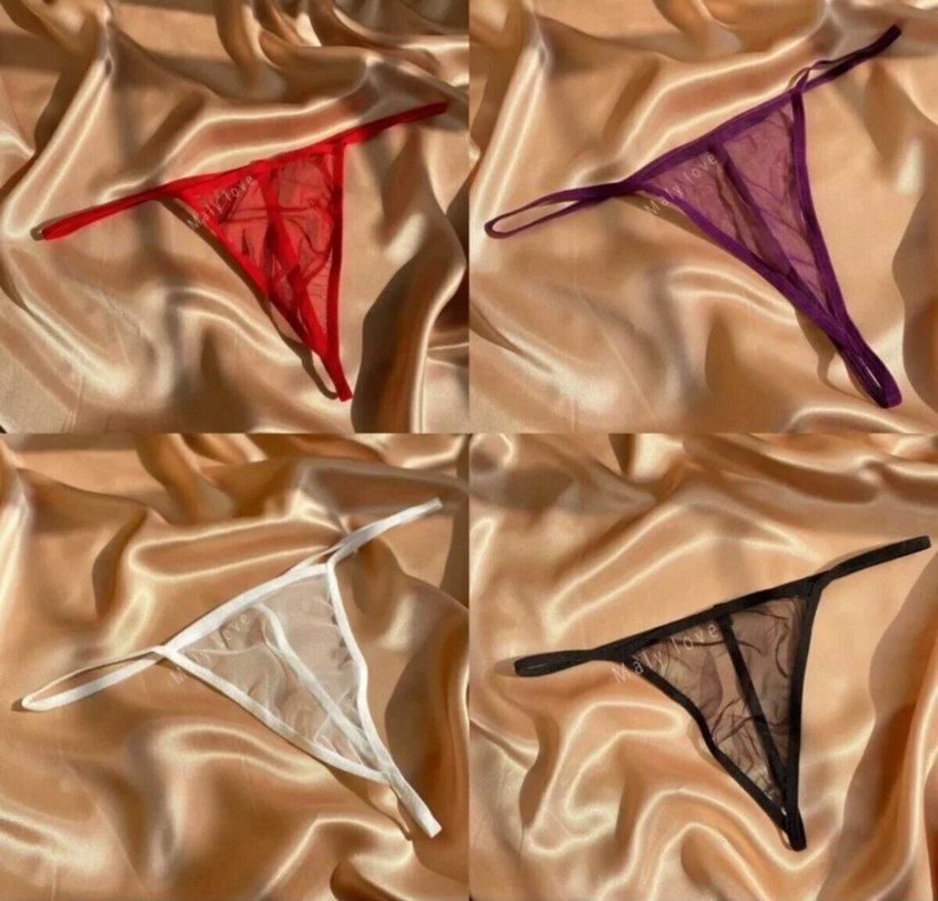 Kırmızı, mor, beyaz ve siyah renklerde, şeffaf ve midi boy kadın iç çamaşırı seti.