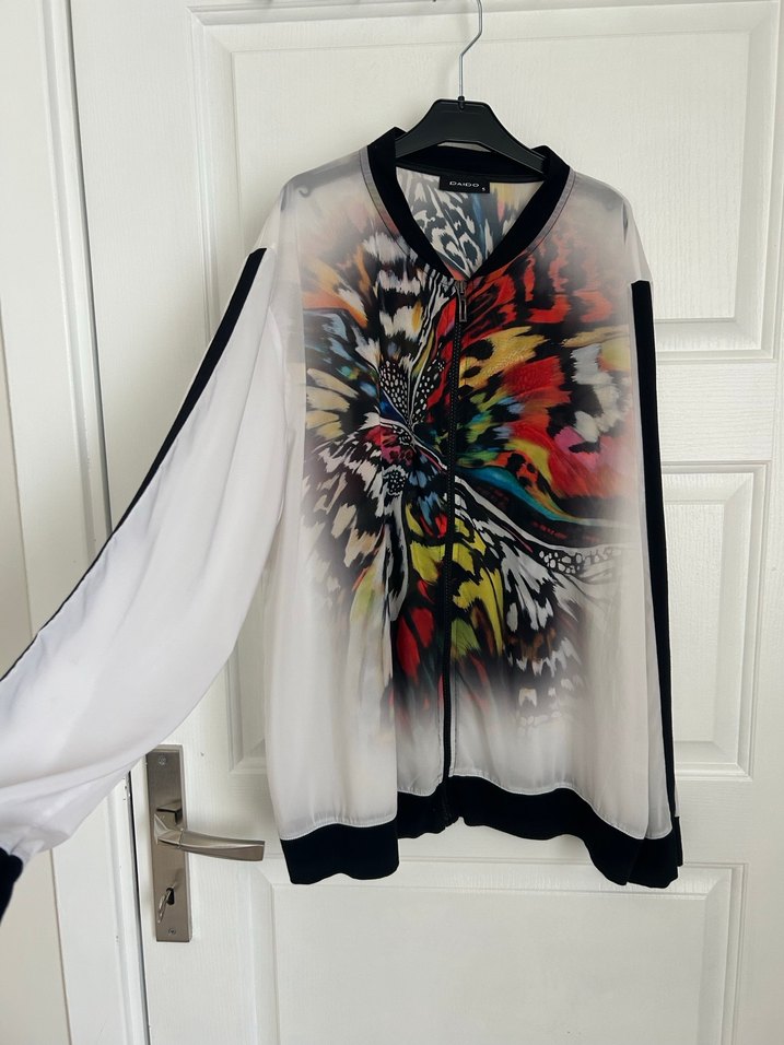 Renkli baskılı, transparan sentetik kumaştan, uzun kollu ve bol kesim kadın bluz. Normal boyda, günlük sokak modasına uygun. Fermuarlı gömlek ince kumaştır iç gösterir. Koltuk altı 58 cm omuz genişliği 45 cm boyu 67 cm etek ucu genişliği 54 cm. Ben 44 bedenken kullandım lütfen ölçüleri kontrol ediniz