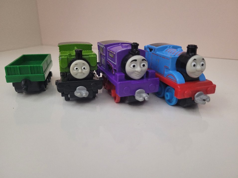 Yeşil, mor ve mavi renklerde üç farklı yüz ifadeli tren oyuncak seti.