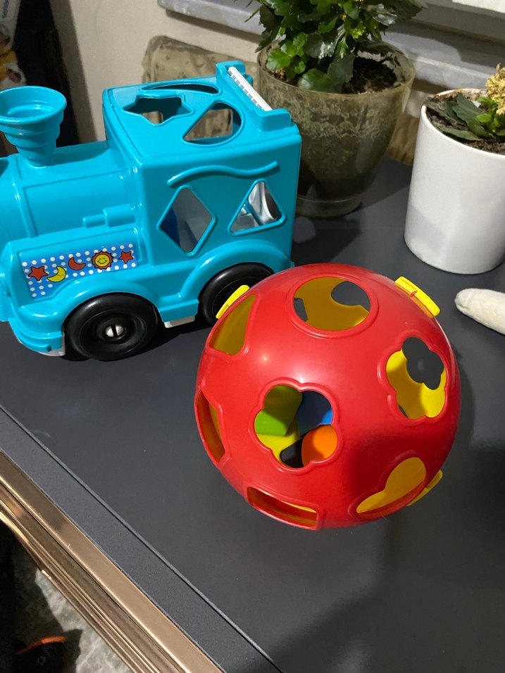 Canlı renklerde mavi tren ve çeşitli şekilli kesitlere sahip kırmızı top oyuncak, çocuklar için eğlenceli ve etkileşimli tasarlanmıştır.