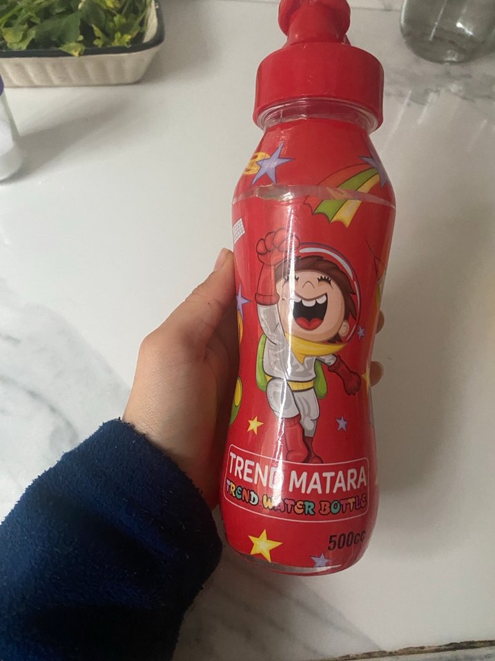500 ml kapasiteli, kırmızı kapaklı ve renkli astronot desenli çocuk su matarası. Trend marka olarak etiketlenmiştir. Ucu az kırıktı dökülmeye engel değil