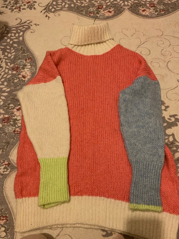 Bu kadın kazak, boğazlı ve uzun kollu, renkli pastel tonlarda triko dokumaya sahip, rahat ve şık bir tasarımdır.