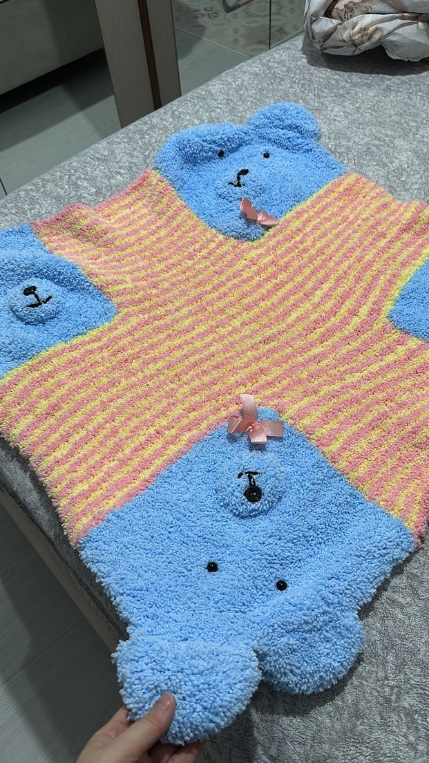 Yumuşak mavi ayıcık figürlü, renkli çizgili triko çocuk battaniyesi. Rahat ve eğlenceli bir tasarıma sahip. Her iki cinsiyet için de uyumludur.78*78 cm ölçülerindedir. Kuzu ipten örülmüştür. Pembe sarı mavi renklerde kurdale motiflidir.