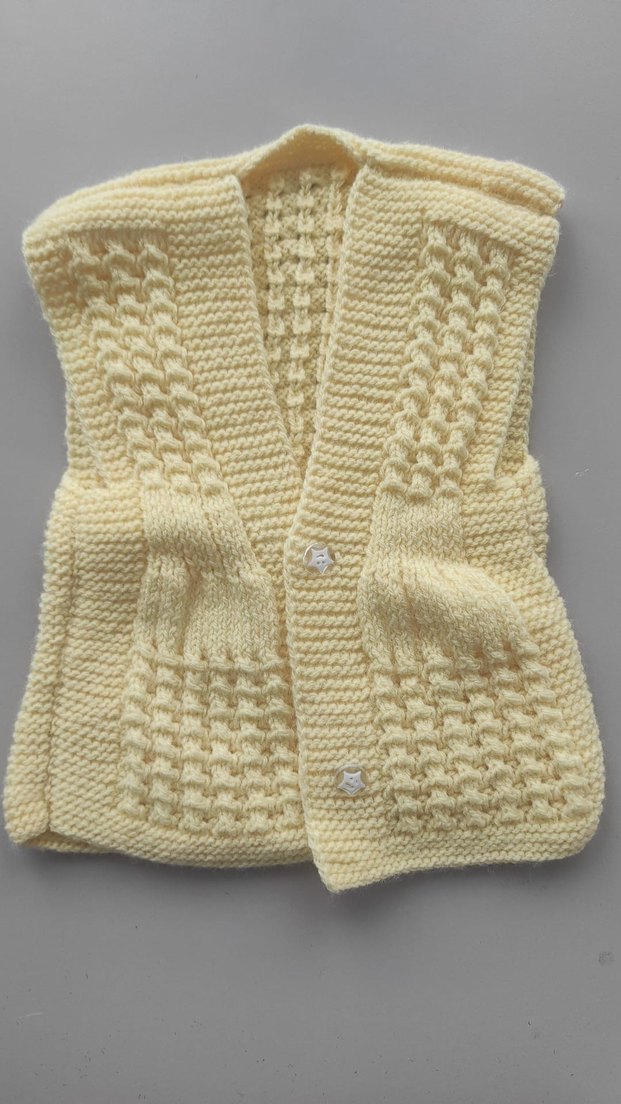 düğmeli ve yakalı triko bebek yeleği. Kolsuz, midi boy ve vücuda oturan rahat bir modeldir. Bebeklerinizin beden ölçüsüne göre ve istediğiniz renklerde örülebilir