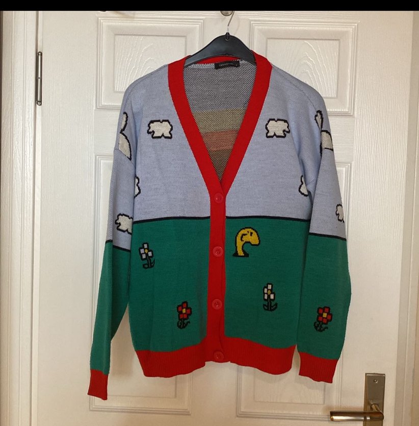 Örgü yün kadın hırka, bol kesim, uzun kollu ve midi boyda. Pastel çok renkli, eğlenceli desenlerle günlük sokak stili için uygundur.