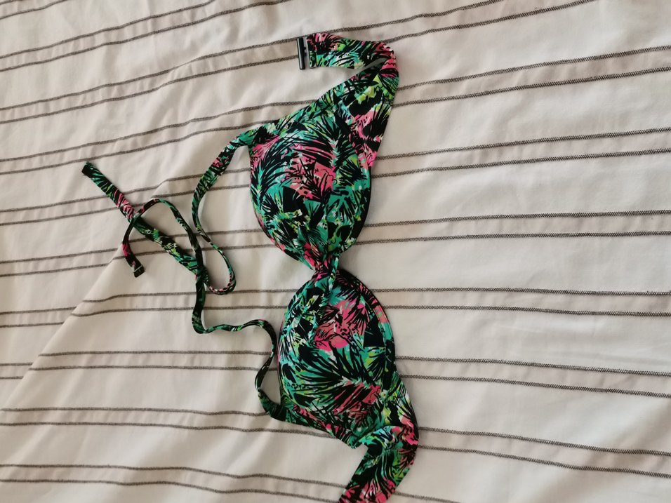 Renkli tropikal desenli, askılı ve vücuda oturan bikini üstü, plaj için uygun.