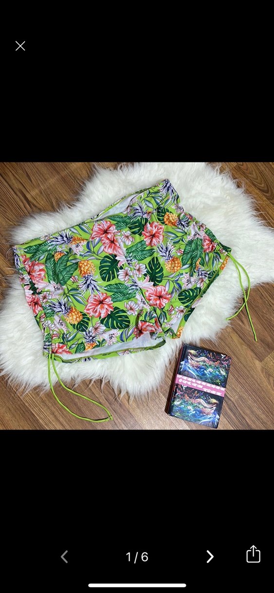 Renkli tropikal çiçek desenli, bol kesim mini şort, ip detaylı yanlar açık hava için uygundur bikini mayo kumaşıdır