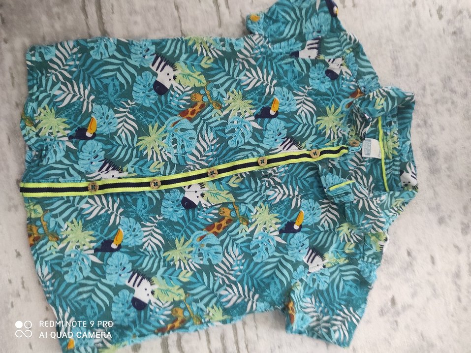 Renkli, tropikal desenli, yakalı ve fermuarlı önden kapamalı, sıkı kesim erkek gömleği. Bohem tarz için ideal.