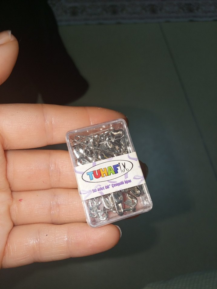 Çeşitli kullanım için 50 adet renkli çengelli iğne, şeffaf plastik kutuda saklanır.