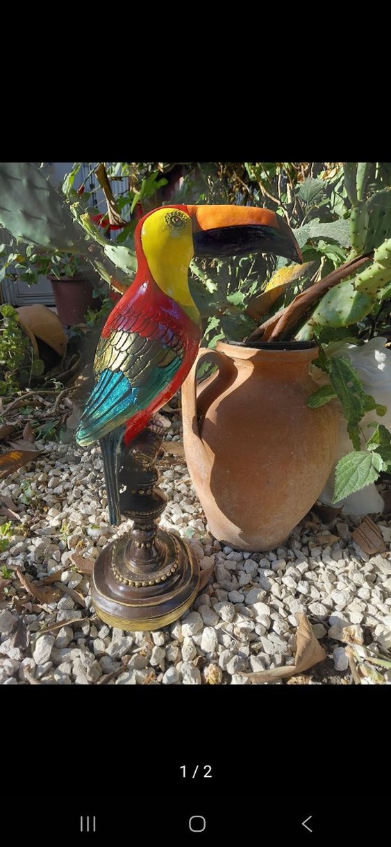 45 cm boy. Polyester ürün. Detaylı kanatlara ve büyük gagaya sahip renkli tukan kuşu biblo, dekoratif bronz taban üzerinde. #tukankuşu #tukan #tukanbiblo #biblo #bahçedekor #evdekor