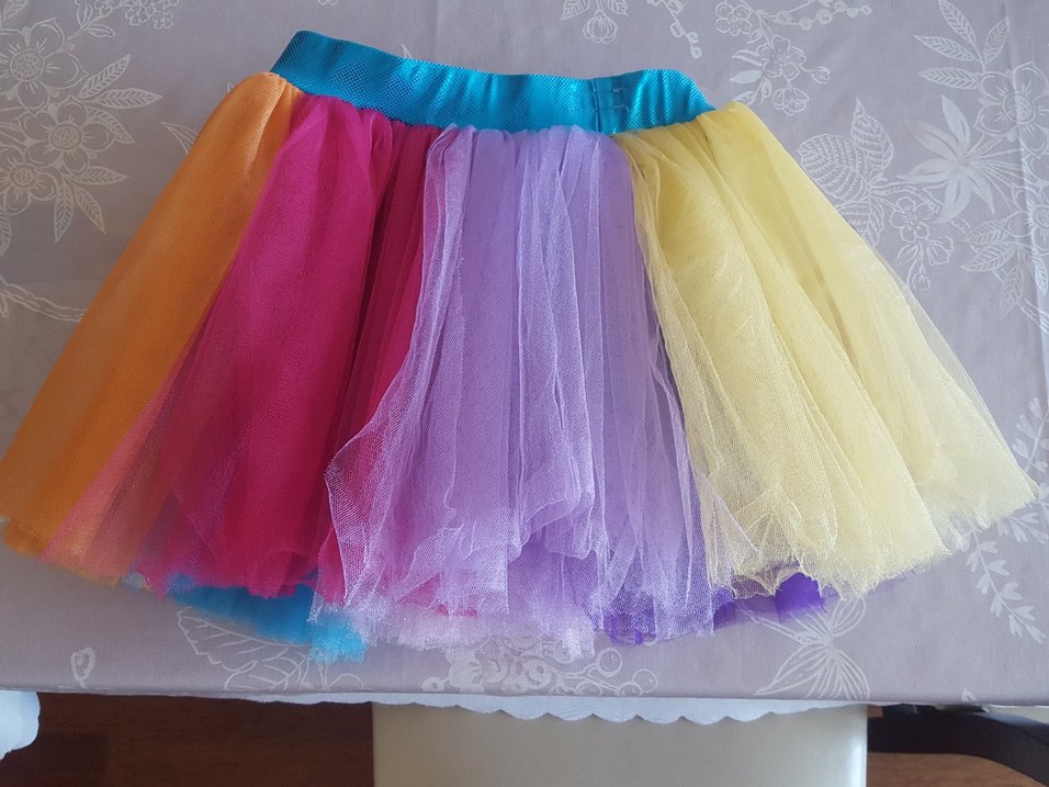 Renkli tül fırfırlı, mavi bel bantlı, yumuşak sentetik kumaştan yapılmış kız çocuk eteği.
