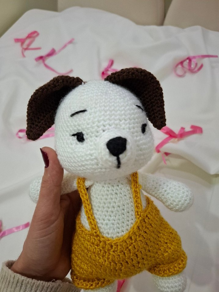 Kahverengi kulaklı, sarı tulum giymiş renkli örgü oyuncak köpek. Yumuşak dokulu ve sevimli.