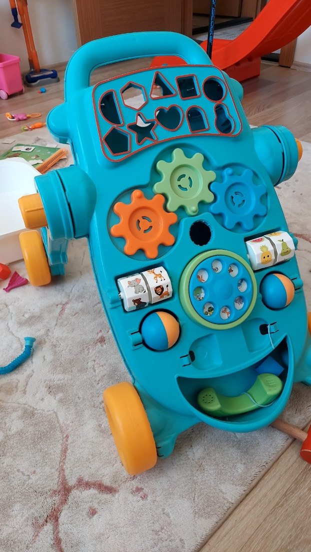 Canlı renklerde turkuaz bebek yürüteci, dişliler, şekil eşleştirme ve dönen silindirlerle dolu, sağlam tekerlekleriyle kolay hareket sağlar. Parçaları tam sadece müzik çalışmıyor aldıktan 2gün sonra bozuldu. Telefonun ipi kopuk ama o yapılabilir.
