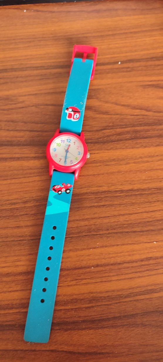 Renkli turkuaz kayışa sahip, pop kültür desenli ve tokalı kol saati. ⌚