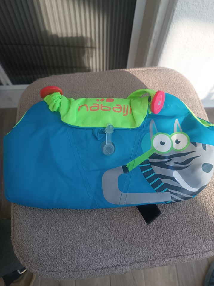 Renkli turkuaz çocuk yüzme can simidi, eğlenceli hayvan baskısı ve "nabai" markası ile çocukların suda güvenli kalmasına yardımcı olur.