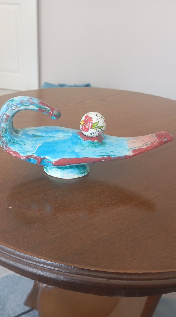Renkli turkuaz renkte, dalga şeklinde tasarıma sahip dekorasyon .Üzerinde dekoratif bir top bulunur. Antika sayılır çok eski bir ürün
