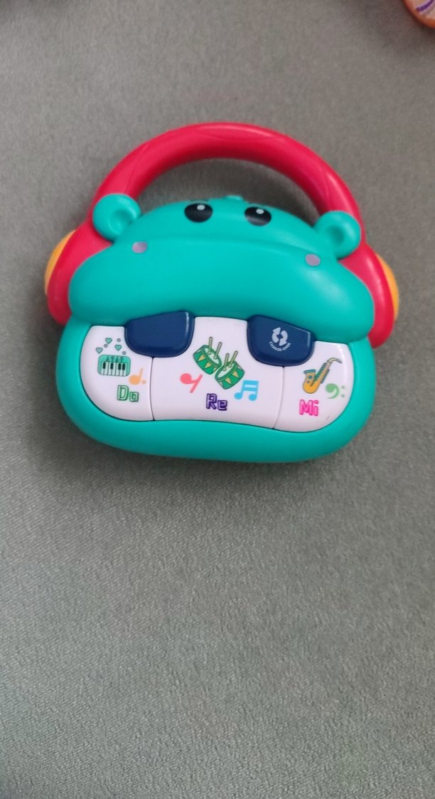 Canlı renklerde turkuaz eğitici oyuncak, M ve Re etiketli müzik notaları ve düğmeler içerir.