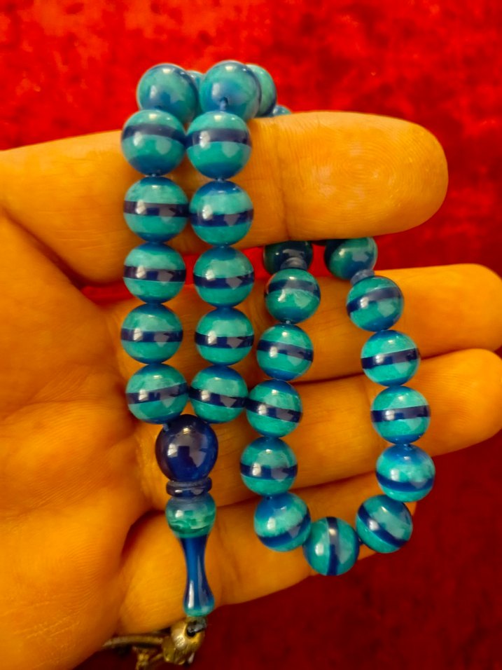 Renkli turkuaz renkte, geleneksel tarzda, yuvarlak ve çizgili desenli erkek tesbih. Bohem tarzını yansıtan şık bir ürün.