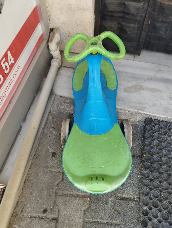 Renkli turkuaz ve yeşil gövdeye sahip, küçük çocuklar için basit direksiyonlu oyuncak araba.